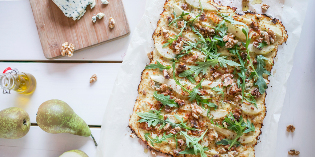 Een van onze klassiekers, de pizza van bloemkoolbodem afgetopt met peer, blauwe kaas, walnoten en rucola. Het duurt wel even, maar dan heb je ook wat!