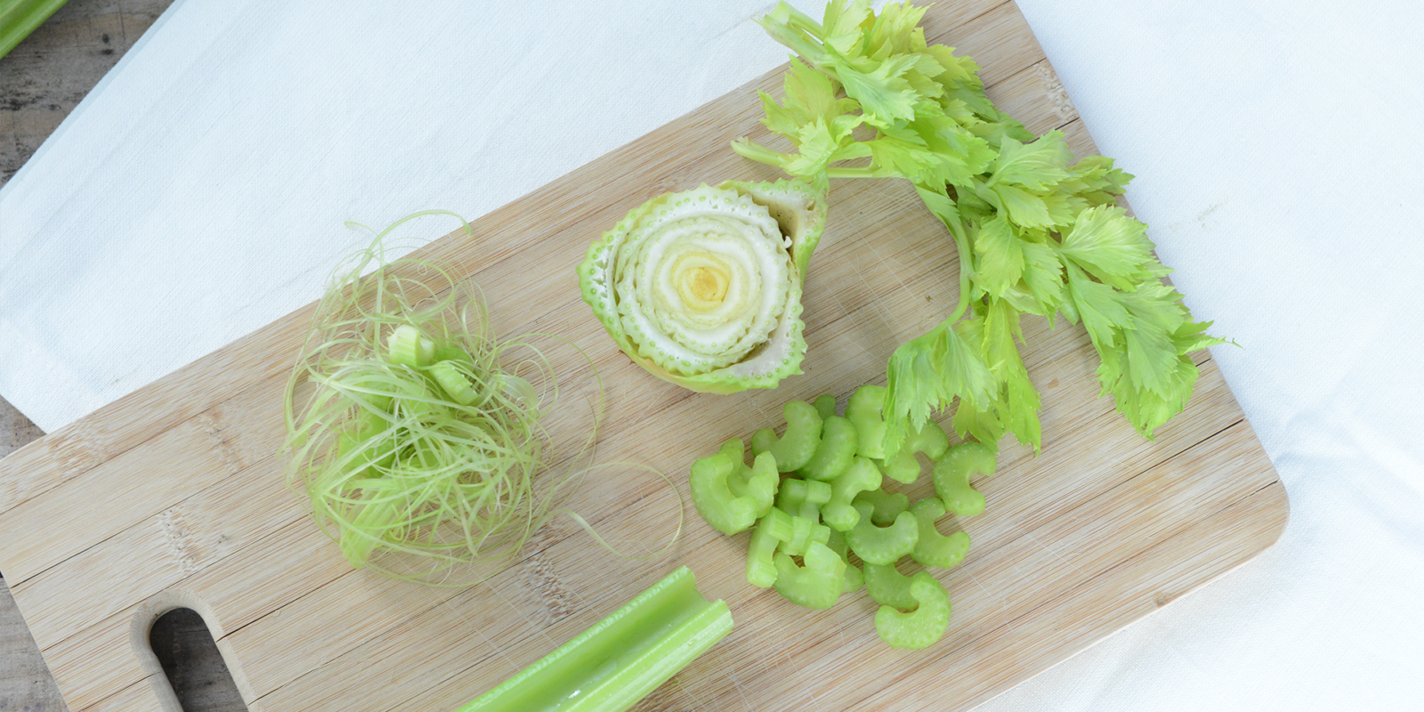 Om te beginnen snijd je het witte gedeelte met fijne worteltjes van de onderkant van de bleekselderij af. Daarna was je de stengels en bladeren grondig. Zowel de stengels als de bladeren kun je eten. Snijd de stengels in stukjes en trek de harde nerven van de stengels af. Je kunt de stengels ook schillen met een dunschiller.