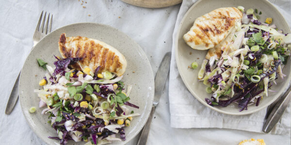 Geen Amerikaanse barbecue zonder ‘cole slaw’. Vandaag maken we een eigen variant op deze traditionele koolsalade. Niet als bijgerecht, maar als hoofdgerecht, én: deels bereid óp de barbecue.